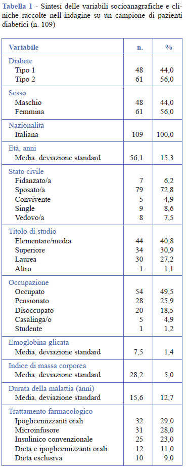 Sono state arruolate 109 persone, di cui il 44,0% (n. 48) con diagnosi di diabete di tipo 1 e il 56,0% (n. 61) di tipo 2. Il 56,0% (n=61) del campione era di sesso femminile, l’età media pari a 56,1 anni (ds = 15,3) e tutti i pazienti erano di nazionalità italiana. La maggior parte dei pazienti (83,9%) ha riportato di avere una relazione di coppia (fidanzato/a, 6,2%; sposato/a, 72,8% o convivente, 4,9%), mentre l’8,6% single e il 7,5% vedovo/a. Per quanto riguarda il titolo di studio, il 40,8% dei partecipanti possedeva un titolo di studio inferiore al diploma di maturità, il 30,9% aveva conseguito il diploma di maturità, mentre il restante 28,3% possedeva titoli di studi superiori (laurea 27,2% o altro titolo di studio, 1,1%).