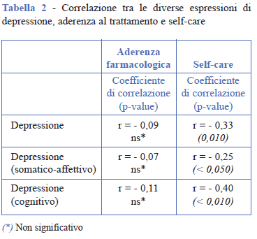 Per quanto riguarda la depressione, il 21,4% dei partecipanti ha riportato sintomi depressivi significativi dal punto di vista clinico e il restante 78,6% livelli normali o minimi di depressione. Dal punto di vista dell’aderenza al trattamento farmacologico più della metà dei partecipanti (57,3%) ha riportato un grado di aderenza elevata, il 33,3% media, mentre solo il 9,4% bassa. Per quanto riguarda il grado di self-care il 56,8% dei partecipanti è risultato avere punteggi che indicano un livello di self-care sufficiente, mentre per il restante 44,2% andrebbe richiesto un approfondimento e la pianificazione di un intervento educativo. Dall’analisi di correlazione tra depressione, aderenza al trattamento farmacologico e il self-care, risulta che la depressione, sia in generale che nel fattore cognitivo e somatico-affettivo, è significativamente correlata in modo negativo solo con il self-care, maggiormente con il fattore cognitivo (r = - 0,40; p-value <0,010) (Tabella 2).