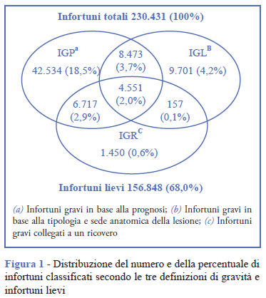 Tra il 2001 e il 2012 sono stati selezionati 785.144 lavoratori per un totale di 3.775.807 anni-persona. Nello stesso periodo sono stati registrati 230.431 infortuni sul lavoro. Circa il 6% (n. 12.875) degli infortuni esaminati sono stati classificati come IGR, circa il 27% (n. 62.275) come IGP e circa il 10% (n. 22.822) come IGL (Figura 1). Complessivamente, circa il 9% (n. 19.898) degli eventi è stato classificato come grave sulla base di almeno due definizioni. Gli eventi considerati gravi con tutte e tre le definizioni sono stati il 2% e costituiscono il 7% degli IGP, il 20% degli IGP e il 35% degli IGR. Tra gli IGR, una elevata proporzione di infortuni (89%) è considerata grave da almeno una delle altre definizioni.