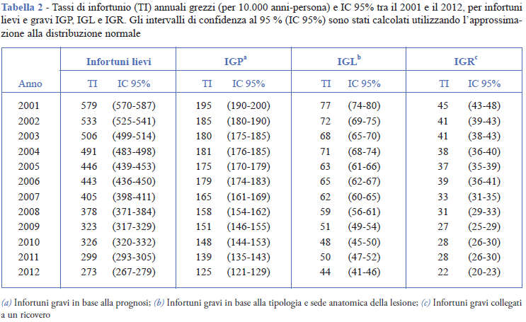 La Tabella 2 mostra i tassi annuali grezzi di infortunio lieve e grave tra il 2001 e il 2012, mentre la Figura 2 rappresenta le corrispondenti variazioni relative annuali, riferite al tasso del 2001. L’andamento dei tassi di infortunio è complessivamente in diminuzione. I tassi di infortuni lievi e IGR sono diminuiti del 52% tra il 2001 e il 2012; nello stesso periodo i tassi di infortuni IGP e IGL hanno una variazione negativa di entità minore, rispettivamente del 43% e del 36%. I tassi IGL e IGR calano nettamente tra il 2008 e il 2009, rimangono pressoché costanti fino al 2011 e poi diminuiscono nuovamente nel 2012. Al contrario, gli infortuni IGP calano in maniera più costante.