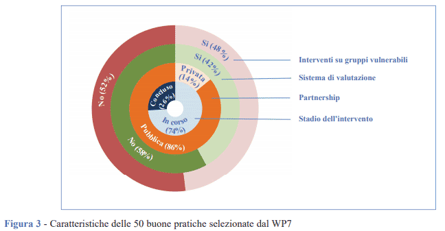 Questo WP aveva come obiettivo la promozione di politiche e interventi sulla corretta alimentazione e l’attività fisica per le donne in gravidanza e le famiglie con bambini piccoli (sotto i 3 anni) (8). L’azione precoce è volta a fornire interventi efficaci per favorire un migliore sviluppo del bambino, con effetti benefici sull’intero ciclo di vita. In tale processo, risulta cruciale coinvolgere, oltre che le madri, i padri e coloro che si occupano dei bambini, in quanto rappresentano un modello per i loro futuri comportamenti sull’alimentazione e sull’attività fisica. Il WP ha identificato, sulla base di criteri ben definiti, i programmi per la prevenzione del sovrappeso e dell'obesità nelle prime fasi della vita, e quindi destinati alle famiglie durante la gravidanza, l'allattamento e la prima infanzia. Dei 13 Paesi partecipanti al WP 7, 11 hanno presentato programmi/ interventi con relativo punteggio, per un totale di 50 iniziative. La maggior parte di queste iniziative (74%) era ancora corso nella fase attuativa della JA, circa la metà era indirizzata a gruppi vulnerabili e riguardava in misura maggiore l’alimentazione piuttosto che l’attività fisica (Figura 3). Sulla base del punteggio ottenuto sono state selezionate 20 pratiche di 9 Paesi (tra cui l'Italia), sottoposte, quindi, a una valutazione qualitativa per approfondirne le caratteristiche. Per l’Italia, oltre al programma nazionale Guadagnare Salute, sono stati selezionati i programmi GenitoriPiù del Veneto e Prevenzione precoce dell’obesità infantile: da meno 9 mesi a più 3 anni attraverso la promozione di sani stili di vita in gravidanza e nelle famiglie dell’Emilia- Romagna.