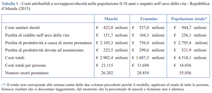 Basato su evidenze relative sia a revisioni della letteratura scientifica, sia a progetti e azioni già messe in atto nei Paesi partecipanti, il modello economico è stato applicato, a titolo esemplificativo, alla Repubblica d’Irlanda, anche se altri Paesi partecipanti al WP, tra cui l’Italia, hanno fornito i dati necessari. Si è stimato che nella Repubblica di Irlanda più di 55.000 persone, che oggi sono bambini e adolescenti in sovrappeso od obesi, moriranno prematuramente a causa di tale eccesso ponderale (circa 1 su 10 di tutte le morti premature) (Tabella 1).