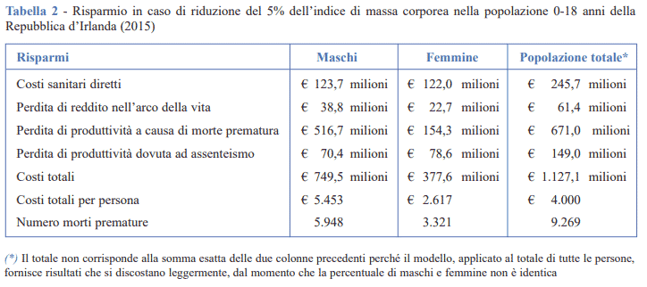 I costi totali stimati per l’intero arco della vita di questi soggetti, attribuibili agli attuali livelli di sovrappeso e obesità, saranno ingenti, pari all'1,6% del Prodotto Interno Lordo (PIL) della Repubblica d'Irlanda (i dati sono relativi al 2015); tali costi ammonterebbero a 4.518 milioni di euro, con costi sanitari diretti di oltre 940 milioni di euro. Al contrario, se l’IMC venisse ridotto del 5%, si otterrebbe un risparmio stimato totale di circa 1.127 milioni di euro e una riduzione di più di 9.000 morti premature (Tabella 2). Il modello economico rappresenta un valido strumento per monitorare e stimare i costi della spesa pubblica legati all’eccesso ponderale tra bambini e adolescenti non solo per i partner di JANPA, ma anche per tutti gli altri Paesi.