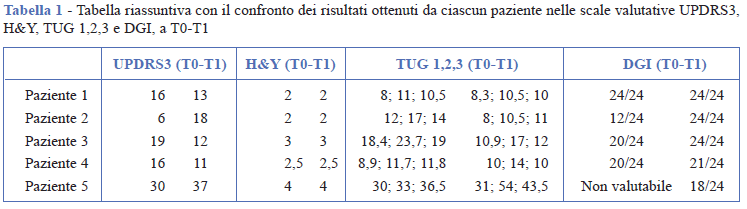 Paziente 4. 60 anni, affetto da MdP di natura tremorigena; alcune dinamiche familiari e lavorative, non hanno consentito di concludere l’intero programma di riabilitazione. Il paziente ha manifestato, perciò, variazioni minime ma non significative; inoltre la sua dimissione, anticipata rispetto alla data prevista, non ha consentito di effettuare una valutazione che potesse verificare effettivi cambiamenti.