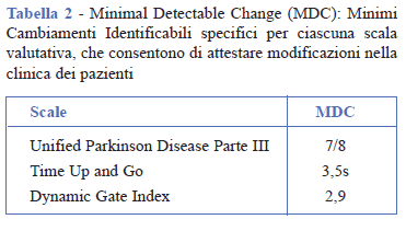 - Unified Parkinson Disease Parte III (UPDRS3) (7), per la compromissione a livello motorio e coordinativo; questa prevede come Minimal Detectable Change (MDC) un punteggio compreso tra 7 e 8 punti;