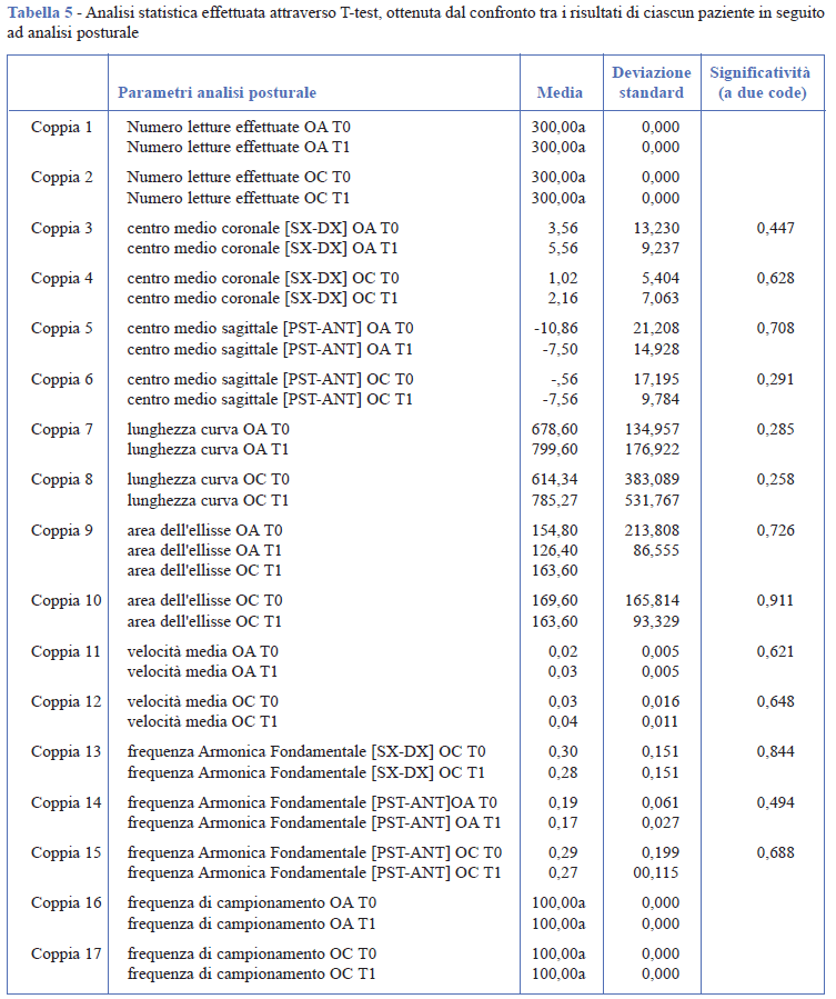 I dati di maggior interesse ricavati dall’analisi posturale, effettuata tramite la pedana sono riportati nella Tabella 3. In seguito è stata effettuata un’analisi statistica, attraverso un test T-student, per verificare l’eventuale presenza di significatività statistica, prima confrontando i dati ottenuti dalle scale valutative a tempo T0 e T1 (Tabella 4) e successivamente quelli ottenuti dalla pedana (Tabella 5). Secondo le attese non è stata attestata significatività statistica, sia per le differenze fenotipiche, sia per la differente gravità dei quadri clinici, sia per la ridotta numerosità campionaria; tuttavia alcuni valori identificati (riportati in grassetto nelle Tabelle 1, 4, 5) hanno una maggiore tendenza ad avvicinarsi alla significatività, senza tuttavia raggiungerla.