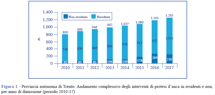 Nella provincia autonoma (PA) di Trento, nel periodo compreso tra il 1° gennaio 2010 e il 31 dicembre 2017, sono stati effettuati 8.205 interventi di protesi di anca. Dal 2010 al 2017, l’insieme degli interventi presenta un incremento del 58%, pari a +7%/anno. Considerando i soli residenti, si registra un incremento del 37%, pari a +4,6%/anno (Figura 1).