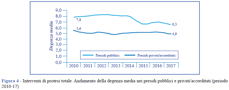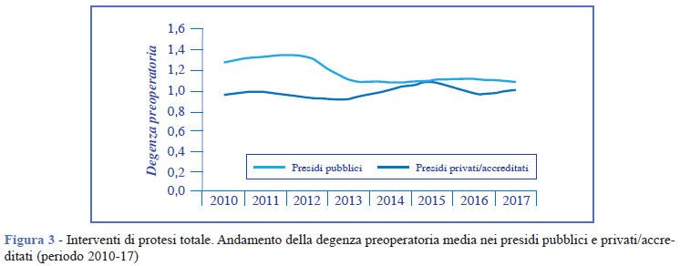 Per quanto riguarda la degenza preoperatoria e la degenza media per i soli interventi di protesi totale, si osserva una riduzione del valore della degenza media preoperatoria per quasi tutti i presidi pubblici che, mediamente, passa da 1,4 giorni a 1,1 giorni, mentre resta costante, seppure con qualche oscillazione, per i presidi privati/accreditati. Al termine del periodo di osservazione, risulta ridotta la distanza tra presidi pubblici e privati/ accreditati (Figura 3).