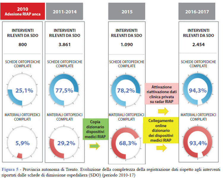 SUMMARY (Temporal trends of some indicators for total hip replacement following the implementation of the Arthroplasty registry of Trento province. An analysis of the hospital discharge data 2010-17) - Arthroplasty registries represent an important tool to monitor use and outcomes of the implanted devices. The objective of this paper is to show how some indicators have changed after the implementation of the Arthroplasty registry of Trento province in 2010. Hospital discharge database was browsed and all hip replacements were extracted (years 2010-17). Attraction and escape index and average length of stay (for total hip replacement) were computed. Completeness of registry was measured. Over the observed period, 8,205 procedures were performed, with a 58% increase. Attraction index increased while escape index decreased. For total hip replacement both preoperative and total length of stay decreased (from 1.4 to 1.1 days, from 7.8 to 6.1 days respectively). Registry completeness increased from 25.1% to 94.3%, for procedure data, and from 5.9% to 93.4% for device data. The implementation of the registry and the continuous reporting activity seem to have supported the improvement of some indicators (mobility, length of stay). Cooperation among all the involved health care providers is essential to improve healthcare quality.