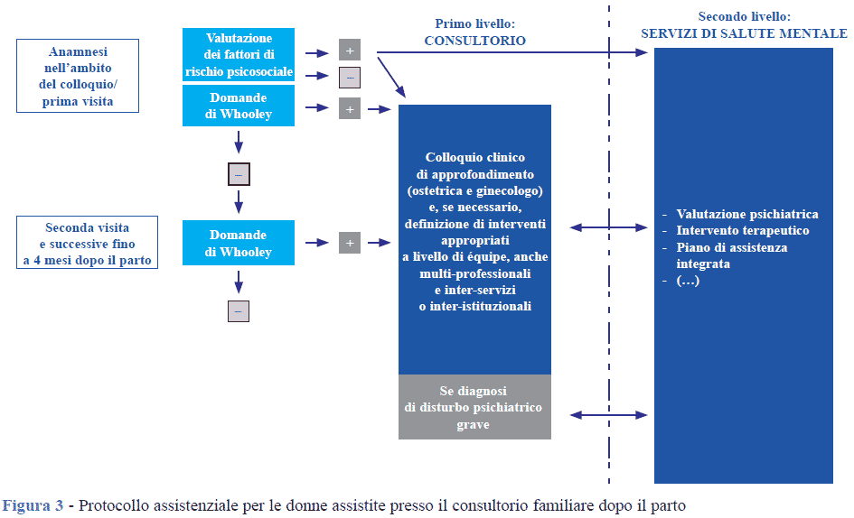 Sono stati quindi definiti i protocolli operativi finalizzati a inserire l’intervento di riconoscimento, valutazione e presa in carico del disagio psichico e sociale perinatale nell’attività clinica abituale dei CF e degli ambulatori ospedalieri della gravidanza a termine dei punti nascita della AUSL (Figure 1-3). A questo punto è stato possibile realizzare un piano di formazione multiprofessionale rivolto ai clinici coinvolti (ostetriche, ginecologi, psicologi, assistenti sociali ed educatori delle équipe consultoriali; ostetriche e ginecologi ospedalieri).