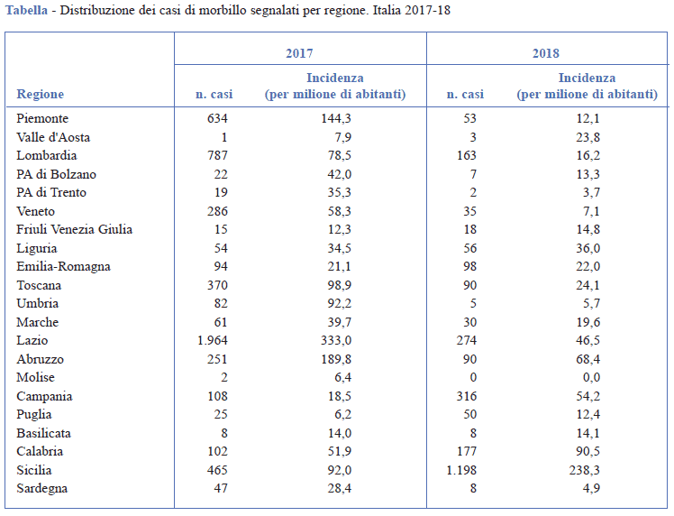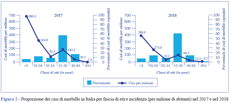Da inizio 2017 a fine 2018 sono stati segnalati in Italia 8.078 casi di morbillo, di cui 5.397 nel 2017 e 2.681 nel 2018 con un’incidenza pari a 89,1 e 44,3 casi per milione di abitanti, rispettivamente.