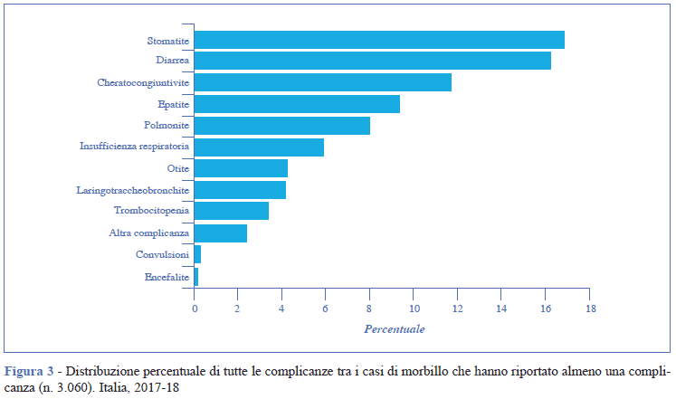 Come atteso, le complicanze hanno colpito prevalentemente i bambini con meno di 5 anni di età e la fascia 15-39 anni. Circa la frequenza delle complicanze, i dati mostrano un lieve incremento rispetto ai dati presenti in letteratura. Nello specifico, il 37,9% dei casi segnalati in Italia ha riportato almeno una complicanza (vs 30% in una casistica americana relativa al 1987-2000), con un’alta proporzione di diarrea (16,3% vs 8,2%) e di polmoniti (8% vs 5,9%), ma una minore proporzione di otiti medie (4,2% vs 7,3%) (6). È possibile che la proporzione più elevata di casi complicati sia dovuta all'età media più alta dei casi in Italia e a una possibile sottonotifica dei casi meno gravi.