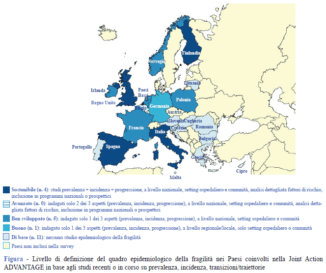 Qual è la frequenza della fragilità in Europa? Quanti casi dobbiamo aspettarci in futuro? Quali sono le caratteristiche e le dinamiche della progressione/regressione della fragilità nel corso del tempo? Quali sono i soggetti a più alto/basso rischio di transizione? Il quadro epidemiologico è ben delineato? Queste sono le principali domande a cui si è cercato di dare una risposta attraverso uno dei gruppi di lavoro (Work Package - WP5) della Joint Action (JA) ADVANTAGE (5), che ha coinvolto 22 Stati europei e 34 istituzioni nella messa a punto di un modello condiviso di prevenzione e gestione della fragilità (6).