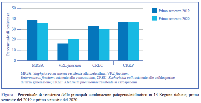 Data obtained during the COVID-19 pandemic phase (March-June 2020) compared to the pre-pandemic months (January-February 2020) showed an increase in the percentages of methicillin-resistant Staphylococcus aureus - MRSA (+1.0%) and carbapenem-resistant Klebsiella pneumoniae - CRKP (+3.0%), and a decrease in the percentages of vancomycin‐resistant Enterococcus faecium - VRE-faecium (-1.7%) and 3d-generation cephalosporins-resistant Escherichia coli - CREC (-2.6%). Comparing the overall data for the fi rst six months of 2019 and 2020, it could be noticed a slight decrease in the percentage of MRSA (-2.2%) and CREC (-2.5%); a large increase in the percentage of VRE-faecium (+4.4%), and a substantial stability for the CRKP isolates.