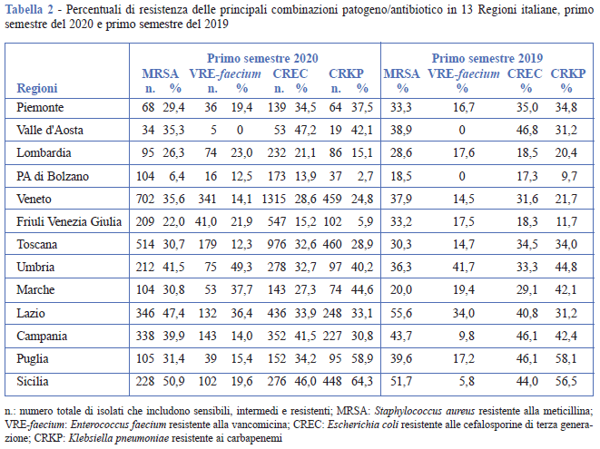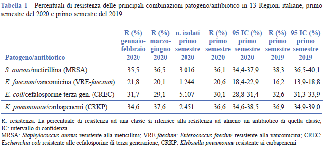 In the year of the SARS-CoV-2 pandemic, antibiotic-resistance (AMR) remains a major threat for global public health. In Europe, Italy is the Country with the highest percentages of AMR, as shown by the National AMR surveillance AR-ISS. The aim of this study was to describe AMR in the fi rst 6 months of 2020, immediately before and during the COVID-19 emergency.
