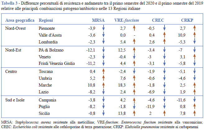 L'impatto della pandemia di COVID-19 sulla resistenza agli antibiotici sembra essere stato marginale, almeno nei mesi iniziali della pandemia in Italia (primo semestre 2020). Il dato più rilevante è la variabilità tra Regioni: vi sono variazioni di segno opposto per cui il dato globale mostra solo un lieve decremento della percentuale di MRSA e CREC, un aumento di VRE-faecium e una invarianza di CRKP.