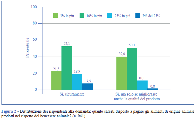 È interessante osservare, infine, come il campione di consumatori, quando gli viene chiesto se sarebbe disposto a pagare a un prezzo maggiorato gli alimenti di origine animale prodotti nel rispetto del loro benessere, si divide equamente tra coloro che si dichiarano disposti senza condizioni aggiuntive e coloro che invece si dichiarano disposti, ma solo se venisse garantito il miglioramento della qualità del prodotto. La disponibilità del consumatore a pagare a fronte di un miglioramento del benessere animale è un tema ampiamente discusso in letteratura (12). Sebbene tale propensione del consumatore fornisca un’utile informazione circa quello che potrebbe essere il suo atteggiamento, non dà indicazioni su quello che potrebbe essere il suo reale comportamento, che andrebbe analizzato con opportune tecniche di indagine.