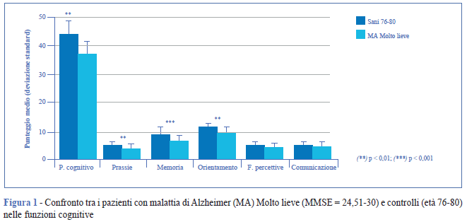Il confronto tra pazienti con malattia di Alzheimer con punteggio MMSE = 24,51-30 e soggetti sani ha confermato la presenza di differenze significative in alcune funzioni cognitive quali: orientamento temporale e spaziale, prassie (p < 0,01) e memoria (p < 0,001) (Figura 1). Sono stati registrati anche deficit nelle funzioni motorie, in particolare nelle prove di coordinazione dinamica e tono muscolare (p < 0,01) (Figura 2).