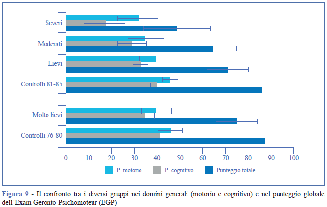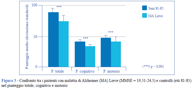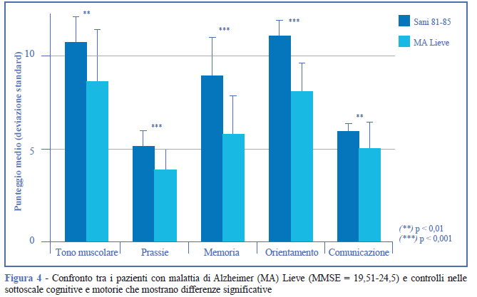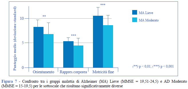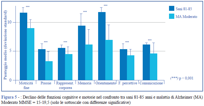 Nel confronto tra soggetti sani e con malattia di Alzheimer con livello di gravità moderato (MMSE = 15- 19,5), le funzioni cognitive che peggiorano risultano essere le funzioni percettive e la rappresentazione corporea. Dal punto di vista motorio, si registrano disturbi della motricità fine (Figura 5).