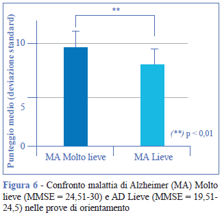 I risultati mostrano il declino dell’orientamento temporale (data del giorno, data di nascita, lettura dell’orologio, orientamento nel calendario, organizzazione temporale di eventi), e spaziale (orientamento geografico, organizzazione topologica, divisione di linee, orientamento di oggetti, orientamento di movimenti) nel passaggio da MMSE = 24,51-30 a 19,51-24,5 (p < 0,01) (Figura 6).