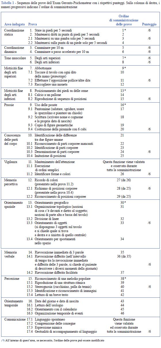 La batteria comprende prove cognitive e motorie che vengono presentate con un ordine preciso tale da evitare effetti di interferenza. Inoltre, l’organizzazione delle prove garantisce la possibilità di effettuare il richiamo differito nei compiti di memoria. Le funzioni cognitive indagate sono: attenzione (attenzione selettiva, esecuzione di ordini semplici e identificazione di forme e colori), memoria percettiva (ricordo di colori e posizioni di parti corporee, richiamo facilitato e riconoscimento), memoria verbale (rievocazione immediata, differita e differita facilitata di parole), linguaggio e comunicazione (linguaggio spontaneo, comprensione, espressione mimica, gestualità), percezione (riconoscimento di una melodia, riproduzione di una struttura ritmica, stereognosia, identificazione e riconoscimento di immagini, lettura di un breve testo), rappresentazione corporea (identificazione di differenze tra due figure umane, riconoscimento di parti corporee mancanti, identificazione di parti corporee, denominazione di parti corporee, imitazione di posizioni), prassie (uso delle posate, pantomime, scrittura, copia di figure geometriche, costruzione della piramide con i cubi), orientamento temporale (data del giorno, data di nascita, lettura dell’orologio, orientamento nel calendario, organizzazione temporale di eventi), orientamento spaziale (orientamento geografico, organizzazione topologica, divisione di linee, orientamento di oggetti, spostamenti nello spazio). Le capacità motorie indagate sono: coordinazione statica (mantenersi in piedi senza appoggio e in punta di piedi), coordinazione dinamica (camminare per 10 m, camminare a passo accelerato), tono muscolare (misurato attraverso prove di mobilizzazione delle articolazioni degli arti superiori ed inferiori), motricità fine degli arti superiori (abbottonare, pianotage, opposizione pollice alle altre dita, raccogliere una moneta) e motricità degli arti inferiori (posizionamento dei piedi su delle orme, calcio a un pallone, sequenza di posizioni). La sequenza delle prove e i rispettivi punteggi sono presentati in Tabella 1. Non esistono nelle versioni precedenti dei punteggi di cut-off (8).