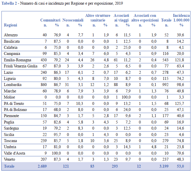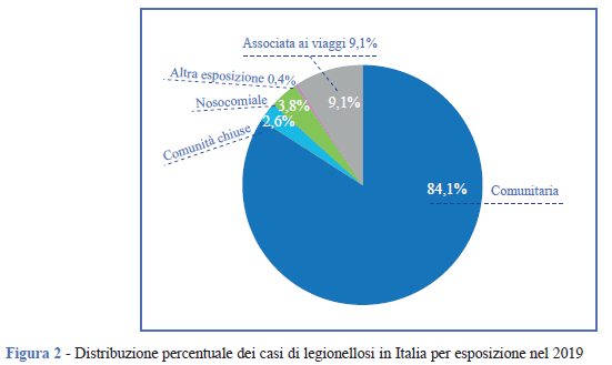 In 2019, notified cases increased by 8% compared to the previous year and the incidence of the disease was higher in the northern regions. For a correct legionellosis diagnosis the use of more than one diagnostic test is highly recommended, in particular the culture method is very useful in order to identify the source of infection.