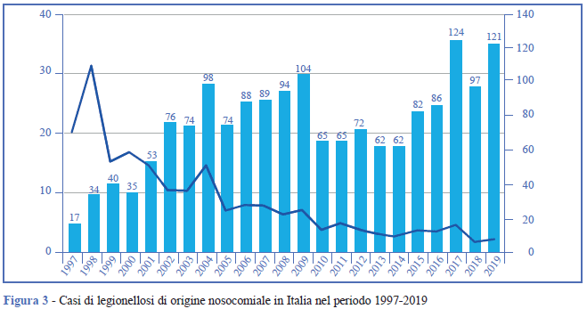 Infezioni nosocomiali Nel 2019 i casi nosocomiali segnalati sono stati 121 (3,8% dei casi totali notificati), di cui 52 (43%) di origine nosocomiale confermata e 69 (57%) di origine nosocomiale probabile. L’andamento dei casi di legionellosi di origine nosocomiale confermata o probabile dal 1997 al 2019 è illustrato in Figura 3.