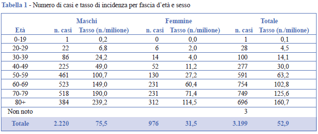 L’età media dei pazienti è di 66,5 anni (deviazione standard: 14,8 anni), con un intervallo compreso tra 0 e 101 anni. Il 67% dei casi ha almeno 60 anni, 69,5% è di sesso maschile e il rapporto maschi/femmine è di 2,3:1.