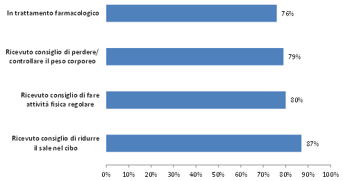 Il trattamento dell’ipertensione si avvale di terapia farmacologica e del cambiamento degli stili di vita, che i medici curanti suggeriscono ai propri assistiti. Tre ipertesi su quattro (76%) hanno dichiarato di essere in cura con farmaci anti-ipertensivi. Il livello di attenzione degli operatori sanitari nei confronti degli assistiti con ipertensione è abbastanza alto: l’87% riferisce di aver ricevuto il consiglio di ridurre il sale nel cibo, l’80% di fare attività fisica regolare e il 79% di perdere/mantenere il peso corporeo.