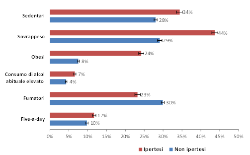 Tra gli ipertesi, le percentuali di sedentari (34%), sovrappeso (44%) e obesi (24%) sono decisamente più alte rispetto a quelle di chi non riferisce ipertensione (che sono rispettivamente 28%, 29% e 8%). La prevalenza di persone che fa un consumo di alcol abituale elevato è del 7% tra quelle con ipertensione contro il 4% tra i non ipertesi. Questi ultimi appaiono meno virtuosi sia rispetto al consumo di almeno cinque porzioni di frutta e verdura al giorno (10% contro il 12% rilevato tra gli ipertesi) sia relativamente al fumo di sigaretta (30% vs 23%).