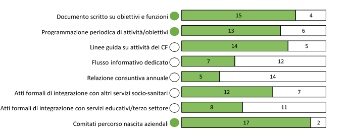 La Regione Abruzzo si è dotata di documenti scritti su obiettivi e funzioni dei CF ed effettua programmazione periodica di attività e obiettivi (aggiornata negli ultimi 3 anni) (Figura 1). Non sono state prodotte linee guida regionali sulle attività dei CF. Non è disponibile un flusso informativo regionale per le attività dei CF e non viene redatta una relazione annuale consuntiva sulle attività svolte e sul raggiungimento degli obiettivi prefissati. Tuttavia, un flusso informativo sulle attività dei CF e una relazione consuntiva annuale sono disponibili in alcune ASL. A livello regionale non sono stati stipulati atti formali di collaborazione con altri servizi sociosanitari territoriali, con la scuola e con associazioni di volontariato. Sono stati istituiti i Comitati percorso nascita aziendali nei quali è prevista la presenza di un rappresentante dei CF.