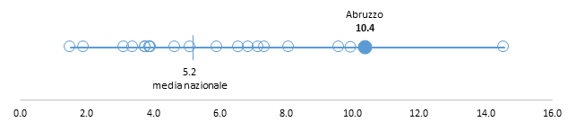 Il numero medio di prestazioni consultoriali erogate dai CF dell’Abruzzo (22,6) è al di sopra della media nazionale e colloca la Regione tra le 6 realtà (5 Regioni e una PA) con il valore più elevato (Figura 5). Questo indicatore permette di tratteggiare un profilo del volume di attività dei CF in ambito nazionale ma va ricordato che parte della variabilità riscontrata è dovuta alla diversa modalità di registrazione delle prestazioni erogate, in particolare quelle relative a singoli utenti o a gruppi di utenti, segnalata a volte anche nell’ambito della stessa Regione.