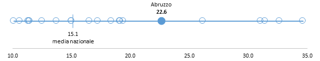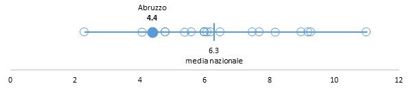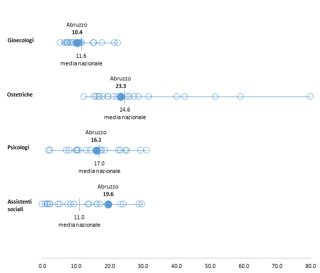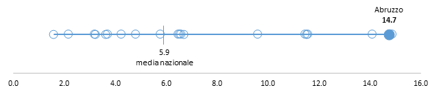 La disponibilità della figura professionale dell’assistente sociale (19,6 ore) è superiore alla media nazionale e posiziona l’Abruzzo tra le 5 Regioni con la maggiore disponibilità di questa figura, pur rimanendo al di sotto dello standard di riferimento di 36 ore.