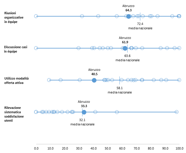 Rispetto alla modalità di lavoro multidisciplinare a livello di singola sede, la percentuale di CF che effettuano regolarmente riunioni organizzative con tutte le figure professionali (64,3%) è di poco inferiore della media nazionale mentre la discussione di casi clinici allargata a tutte le figure dell’équipe (61,9%) è in linea con il valore medio (Figura 8). La modalità dell’offerta attiva viene utilizzata nel 40,5% dei CF, con un valore molto inferiore alla media nazionale, che colloca l’Abruzzo tra le 4 Regioni con i valori più bassi per questo parametro. La rilevazione sistematica della soddisfazione degli utenti è una prassi diffusa in circa 1 CF su 3 (33,3%), in linea con la media nazionale