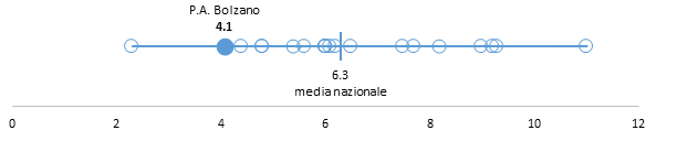 Questa misura sintetica dell’integrazione a livello di Comprensorio/Distretto tra servizi consultoriali e gli altri servizi sanitari aziendali, i servizi sociali, la scuola e il terzo settore, nella PA di Bolzano è pari a 4,1 e colloca la PA di Bolzano al penultimo posto in Italia relativamente a questo parametro (Figura 6).