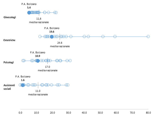 Prima di descrivere i risultati rappresentati nella figura 7 è opportuno specificare che nella PA di Bolzano esistono sedi principali e secondarie di consultorio, con gli stessi professionisti che ruotano su più sedi. Inoltre, dato il diverso ambito di competenza dei consultori pubblici e privati accreditati, l’équipe del consultorio pubblico non prevede la presenza di psicologo e assistente sociale.
