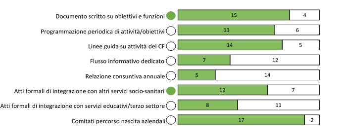 La Regione Calabria si è dotata di un documento scritto su funzioni e obiettivi dei consultori (Figura 1). Sono presenti a livello regionale atti formali di integrazione con gli altri servizi territoriali ma non con la comunità (scuola, associazioni di cittadini e di volontariato). Nel 2019 il flusso informativo sulle attività dei CF risultava attivo solo in alcune ASP.