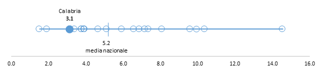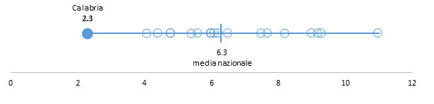 Nei grafici presentati a seguire, viene rappresentato per ogni indicatore l’intero intervallo di variabilità per le 19 Regioni e PA. Il valore dell’indicatore riferito alla Regione in studio è rappresentato dal pallino colorato, mentre la barra verticale corrisponde alla media nazionale. I pallini bianchi rappresentano il valore assunto dall’indicatore nelle altre Regioni e PA.