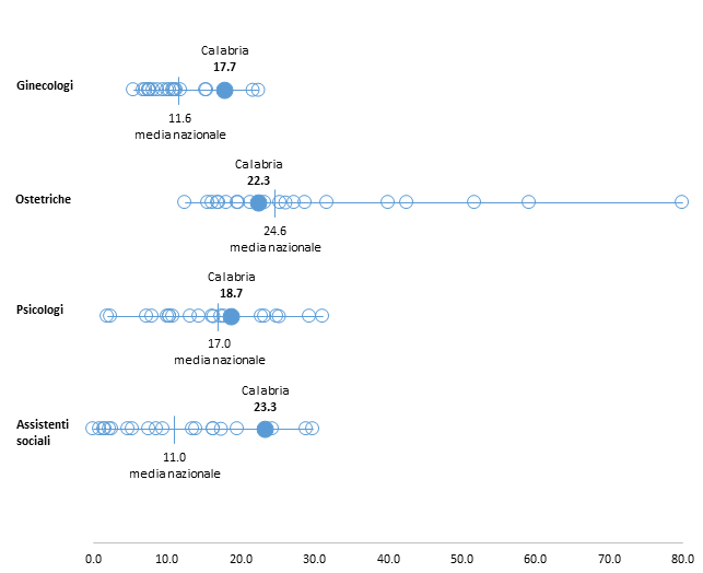 Nelle realtà partecipanti la disponibilità della figura professionale del ginecologo (17,7 ore) è fra le più alte riscontrate a livello nazionale, in linea con il gold standard delle 18 ore settimanali (Figura 7). La disponibilità della figura professionale dell’ostetrica (22,3 ore) è di poco inferiore al valore medio nazionale, anche se lontana dal gold standard di 36. La disponibilità della figura professionale dello psicologo (18,7 ore) è in linea con il valore medio nazionale e con il valore di riferimento di 18 ore. La disponibilità della figura professionale dell’assistente sociale (23,3 ore) è superiore alla media nazionale, ma molto al di sotto del gold standard di 36 ore.