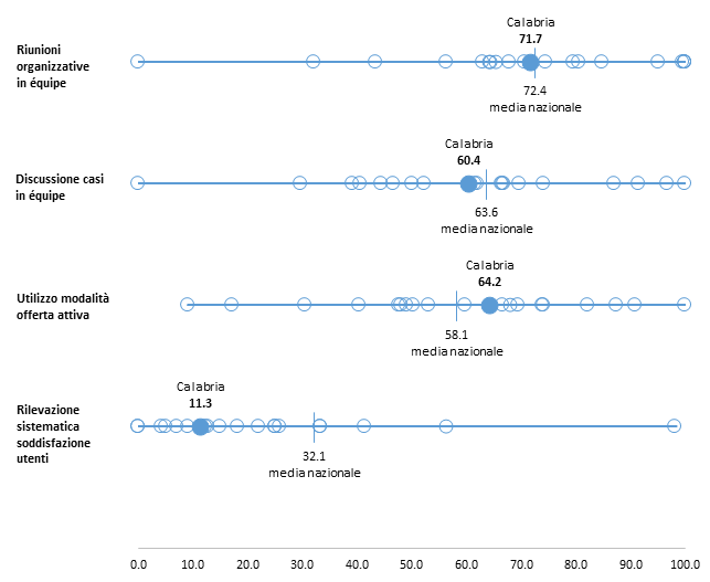 Rispetto alla modalità di lavoro multidisciplinare a livello di singola sede, la percentuale di CF che effettuano regolarmente riunioni organizzative con tutte le figure professionali (71,7%) e la discussione di casi clinici allargata a tutte le figure (60,4%) sono in linea con la media nazionale (Figura 8). La rilevazione sistematica della soddisfazione degli utenti è una prassi diffusa solo in circa 1 CF su 10 (11,3%), con una valore pari a circa un terzo della media nazionale. La modalità dell’offerta attiva –in misura sovrapponibile nelle diverse ASP - è utilizzata da circa il 64% dei CF ed appare quindi più diffusa rispetto alla media nazionale; 8 Regioni e 1 PA hanno valori più elevati della Calabria relativamente a questo indicatore, mentre 10 Regioni si collocano al di sotto.