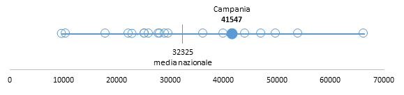 La diffusione delle sedi consultoriali in Campania, pari a una sede di CF ogni 41.547 residenti - circa il doppio rispetto al gold standard di 20.000 abitanti per sede - è inferiore alla media nazionale (Figura 2). A livello aziendale si riscontra un’ampia variabilità, compresa tra i 23.000 residenti per sede nella ASL di Avellino e i 54.000 nella ASL Napoli 1.