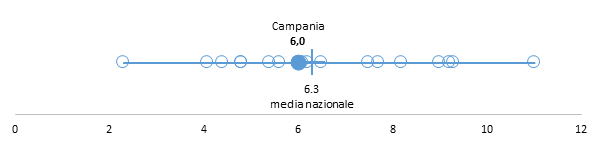 La figura professionale la cui disponibilità oraria è maggiormente distante dal valore medio nazionale è quella dell’ostetrica (15,5 ore); la Campania si colloca fra le 2 Regioni dove questa figura è meno presente, con un numero medio di ore inferiore alla metà dello standard di riferimento di 36 ore settimanali. Anche la disponibilità della figura professionale dello psicologo (10,1 ore) è inferiore alla media nazionale e al gold standard (18 ore), come quella dell’assistente sociale (7,6 ore), figura professionale per la quale la carenza appare più rilevante, pari a circa 1/5 del valore di riferimento ottimale di 36 ore.