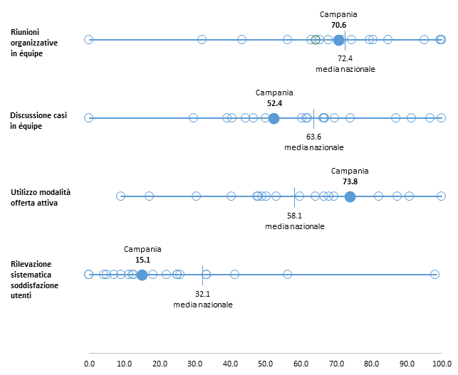 La modalità dell’offerta attiva è utilizzata dal 73,8% dei CF e raggiunge il 90% in 2 delle 7 ASL regionali, collocando la Regione al di sopra della media nazionale e tra le 6 realtà (5 Regioni e 1 PA) con i valori più elevati. Il dato assume particolare rilievo alla luce della ridotta disponibilità di personale che caratterizza i servizi consultoriali della Campania.