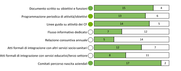 Il Lazio a livello regionale si è dotato di documenti scritti su obiettivi e funzioni dei CF, ha prodotto linee guida sulle attività dei CF ed effettua programmazione periodica di attività e obiettivi (aggiornata negli ultimi 3 anni) (Figura 1). Non è stato attivato un flusso informativo regionale per le attività dei CF e non viene prodotta periodicamente una relazione consuntiva sulle attività svolte e sul raggiungimento degli obiettivi prefissati. Non sono stati stipulati atti formali di collaborazione di livello regionale con altri servizi sociosanitari territoriali, con la scuola e con associazioni di volontariato. Sono stati istituiti i Comitati percorso nascita aziendali nei quali è prevista la presenza di un rappresentante dei CF.