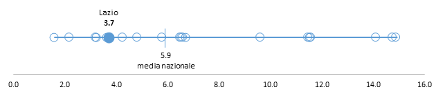 La capacità attrattiva dei CF nel Lazio (3,8%) è inferiore alla media nazionale ed è pari a circa la metà del valore di riferimento riscontrato nelle 5 Regioni con la capacità attrattiva più elevata (>8%), individuato come possibile standard al quale tutte le Regioni potrebbero tendere (Figura 3). Anche per questo indicatore la variabilità aziendale è elevata e compresa tra l’1% di Latina e l’11% di Rieti.
