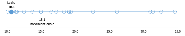 Nei grafici presentati a seguire, viene rappresentato per ogni indicatore l’intero intervallo di variabilità per le 19 Regioni e PA. Il valore dell’indicatore riferito alla Regione in studio è rappresentato dal pallino colorato, mentre la barra verticale corrisponde alla media nazionale. I pallini bianchi rappresentano il valore assunto dall’indicatore nelle altre Regioni e PA.
