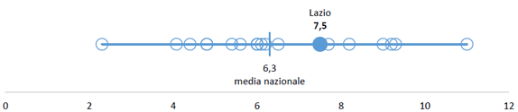 Il livello di integrazione definito dal numero medio di atti di collaborazione stipulati con gli altri servizi sanitari aziendali, con i servizi sociali, con la scuola e il terzo settore per ASL o Distretto (7,5) è al di sopra del valore medio nazionale, collocando il Lazio tra le 7 realtà (6 Regioni e 1 PA) con il valore più elevato relativamente a questo parametro (Figura 6).