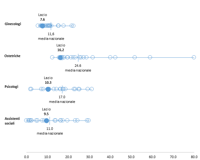 Complessivamente i coordinatori dei servizi consultoriali del Lazio hanno riportato la presenza di 133 sedi e di 71 équipe complete (ginecologo, ostetrica, psicologo e assistente sociale), con un rapporto medio di 1,9 sedi per équipe e con la ASL RM4 che mostra una situazione particolarmente critica per la presenza di una sola équipe a fronte di 11 sedi consultoriali. La disponibilità della figura del ginecologo (7,6 ore) è inferiore al valore medio nazionale, ben lontanoa dallo standard di riferimento di 18 ore, e pone il Lazio tra le 6 Regioni con i valori più bassi per questo parametro (Figura 7). Anche la disponibilità della figura professionale dell’ostetrica (16,2 ore) è inferiore alla media nazionale e al gold standard di 36 ore. La Regione Lazio si colloca tra le 3 Regioni con i valori più bassi per questo parametro, molto lontana dai valori medi delle realtà che hanno adottato un modello di assistenza territoriale alla gravidanza fisiologica centrato su questa figura professionale.