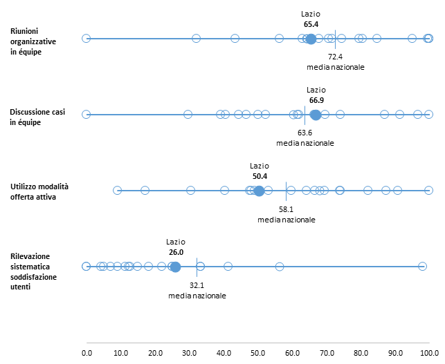 Per quanto riguarda la modalità di lavoro multidisciplinare a livello di singola sede, la percentuale di CF che effettuano regolarmente riunioni organizzative con tutte le figure professionali (65,4%) è inferiore alla media nazionale mentre la discussione dei casi clinici in équipe è una modalità adottata dal 66,9% dei CF, in linea con la media nazionale (Figura 8). La percentuale di CF che utilizzano la modalità dell’offerta attiva (50,4%) è al di sotto della media nazionale, ma il dato è di rilievo se letto alla luce della ridotta disponibilità di personale che caratterizza i CF della Regione. La rilevazione sistematica della soddisfazione degli utenti effettuata dal 26,0% dei CF, sebbene al di sotto della media nazionale, colloca il Lazio al primo posto fra le Regioni dell’Italia centrale relativamente a questo parametro.