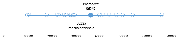 Con una sede ogni 36.247 residenti il Piemonte ha una diffusione dei CF inferiore rispetto alla media nazionale (Figura 2). Il numero dei residenti per sede raggiunge quasi il doppio del gold standard di un consultorio ogni 20.000 residenti. Sono 13 le realtà (12 Regioni e 1 PA) che hanno un numero di residenti per sede inferiore a quello del Piemonte e quindi una maggiore diffusione sul territorio.